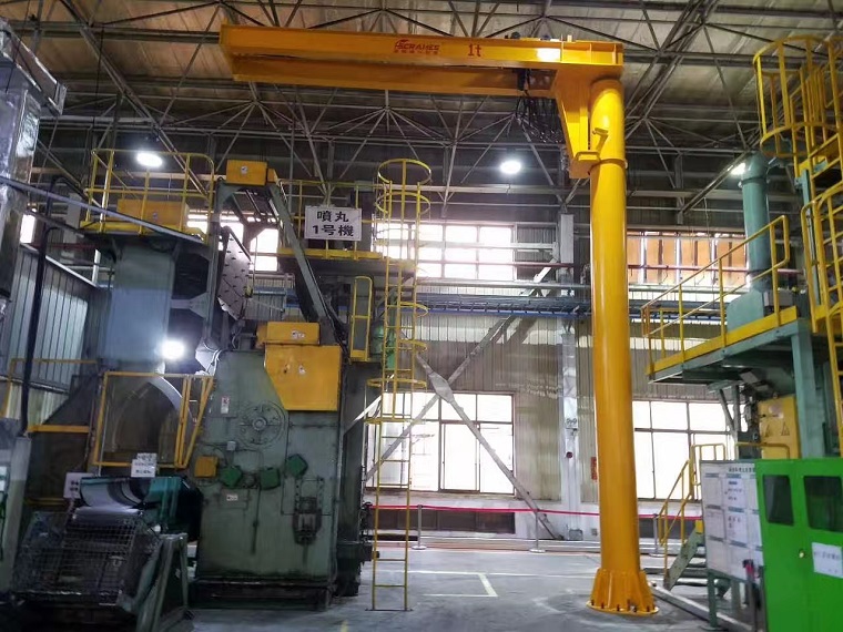 雙臂旋臂吊作業強度為輕型,起重機由立柱,回轉臂回轉驅動設備及電動葫蘆組成,立柱下端通過地腳螺栓固定在混凝土基礎上,由擺線針輪減速設備來驅動旋臂回轉,電動葫蘆在旋臂工字鋼上作左右直線作業,并起吊重物。